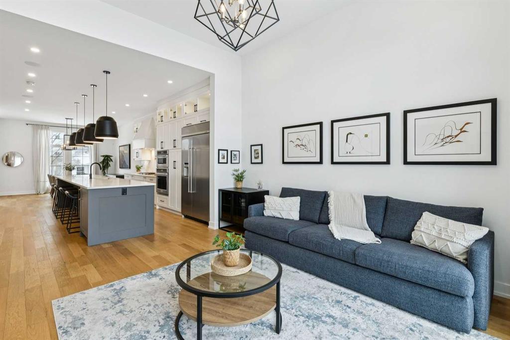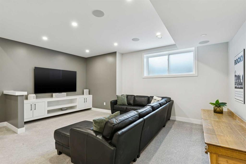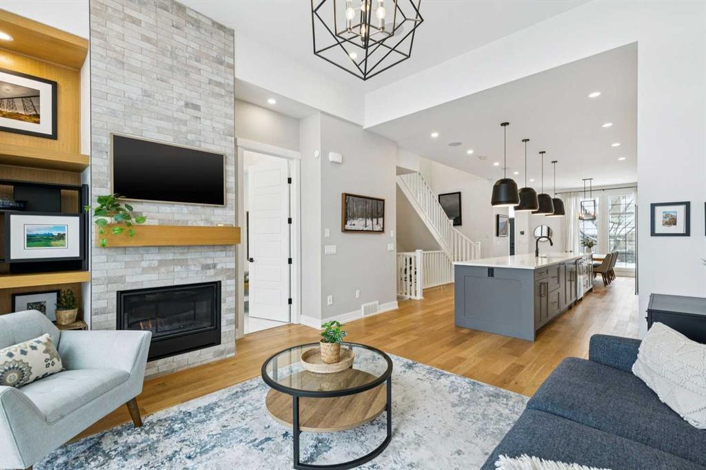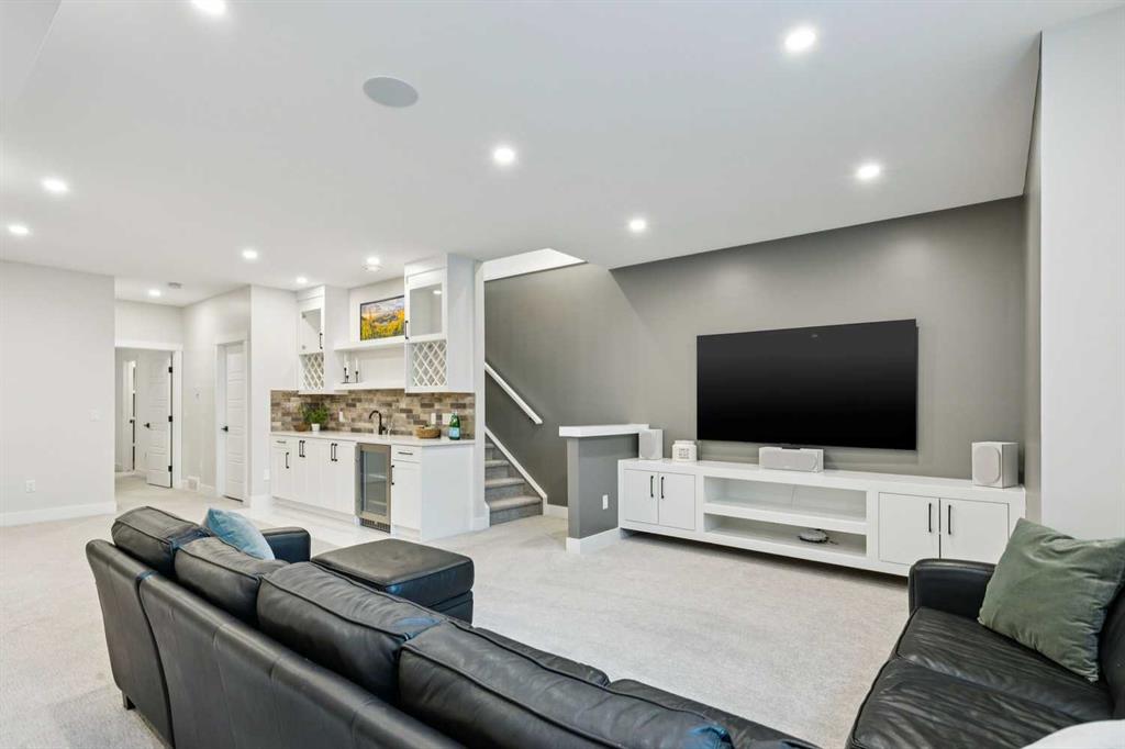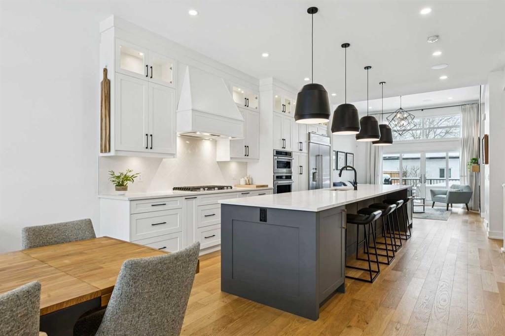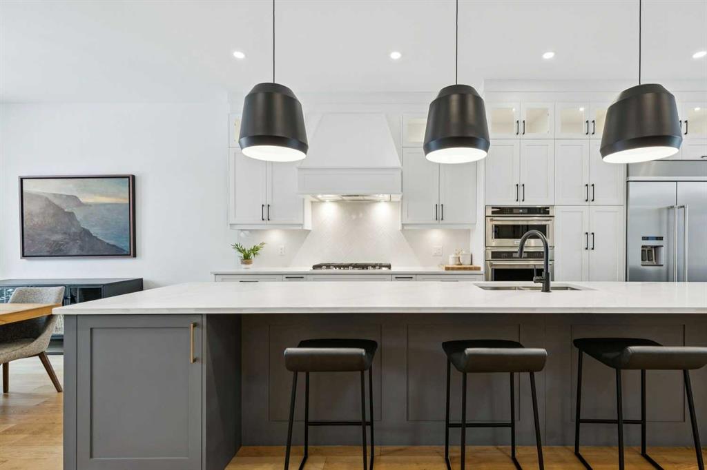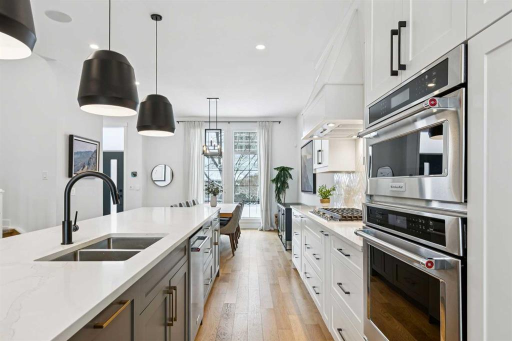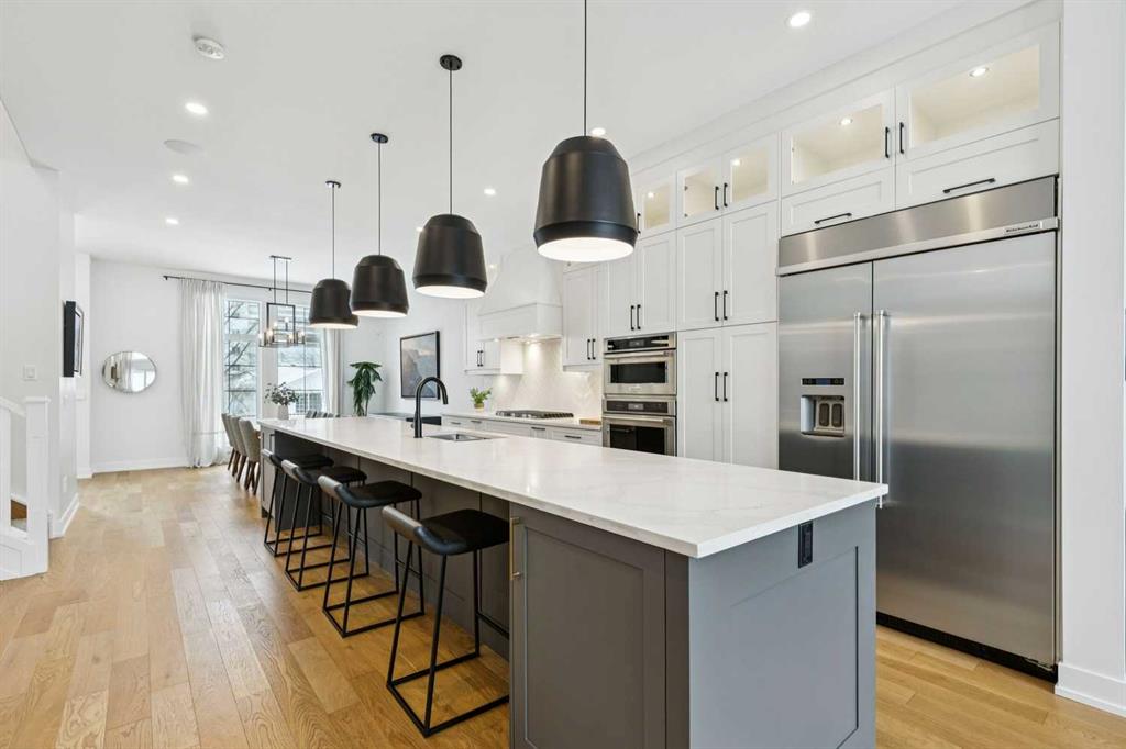 WOW ! Locals love this pocket of Hillhurst for its walkability to top-rated schools and its charming, tree-lined streets. Tucked away from main thoroughfares and set on an extra-deep 135’ west-facing backyard, this home offers a quiet residential feel that’s increasingly rare in the inner city. Savvy buyers will immediately recognize the value of purchasing a truly turn-key, like-new home where all of the thoughtful upgrades have already been completed. Tasteful custom window coverings, upgraded lighting, central air conditioning, Kinetico water softener, feature-painted walls, added shelving and hooks throughout, custom wool stair runners, built-in ceiling speakers, and a statement custom front door — it’s all done. The property is expertly landscaped, both front and back, including a beautiful custom stone patio that creates a perfect outdoor entertaining space. The fully finished garage is EV-ready and drywalled and painted for a clean, polished look. The interior selections are clean and timeless, yet still full of personality. Ceiling heights throughout the home elevate the overall feel — soaring 10- and 12-foot ceilings on the main floor, 10-foot ceilings upstairs, and 9-foot ceilings in the fully finished lower level create a bright, airy atmosphere rarely found in infill properties. The main floor layout is ideal for both daily living and entertaining. A stunning 16-foot island anchors the kitchen — a true statement piece and natural gathering space for friends and family. The kitchen is beautifully appointed with full-height crisp white cabinetry, quartz countertops throughout, abundant storage, and expansive prep space. Premium appliances include a 5-burner gas cooktop, wall oven, convection microwave, dishwasher, and a 48-inch side-by-side built-in refrigerator, creating a seamless, high-end aesthetic. Whether hosting a dinner party or enjoying casual mornings at the island, this space delivers exceptional style and functionality. The front dining area overlooks the charming tree-lined street, while the rear living room — featuring a fireplace with included Samsung Frame TV — opens through sliding doors to the sunny west-facing deck and professionally designed backyard, perfect for summer evenings and entertaining. The mudroom is thoughtfully designed with built-in lockers and bench seating, and even the front entry impresses with a spacious walk-in closet. Upstairs, the primary retreat enjoys west exposure and a private balcony overlooking the lush neighbourhood streetscape — perfect for catching the evening sun. The spa-inspired ensuite features a freestanding tub, custom glass shower, double vanity, heated floors, and a private water closet. The upper laundry room includes side-by-side Electrolux machines, sink, and hanging space. The fully finished lower level is where the fun happens. Featuring radiant in-floor heating, a spacious open recreation area, and a massive entertainer’s bar complete with beverage centre !