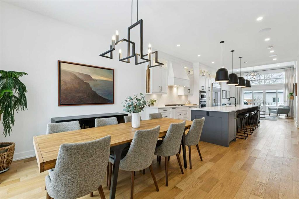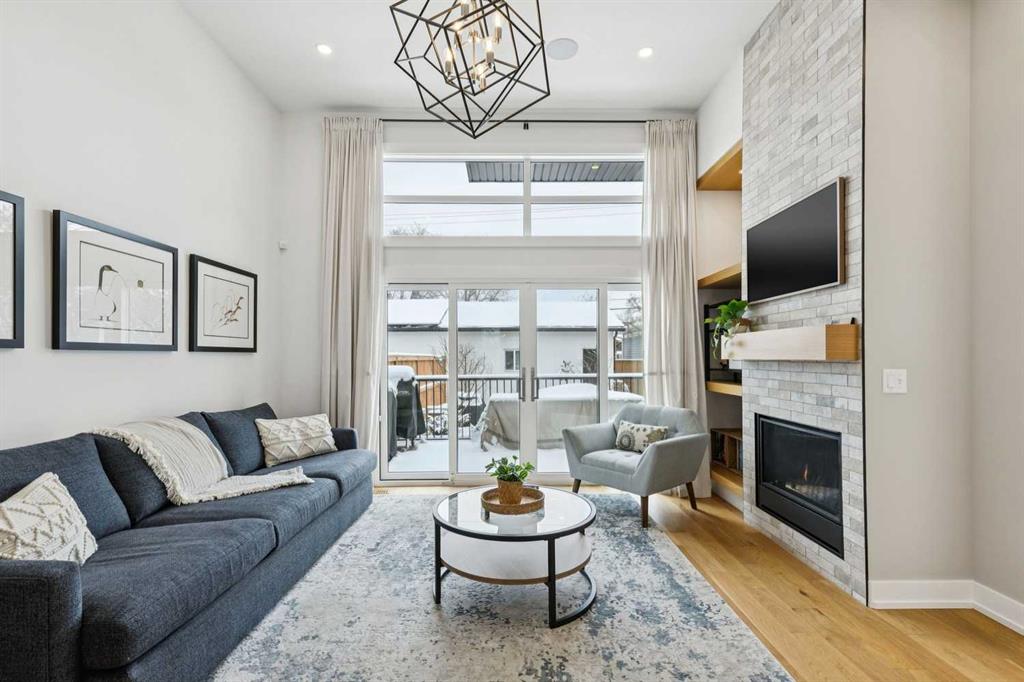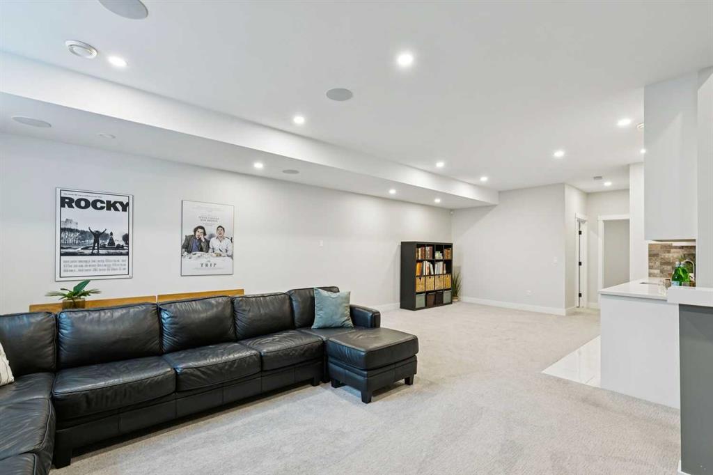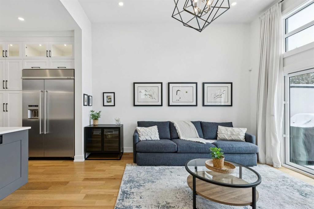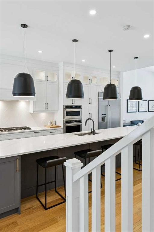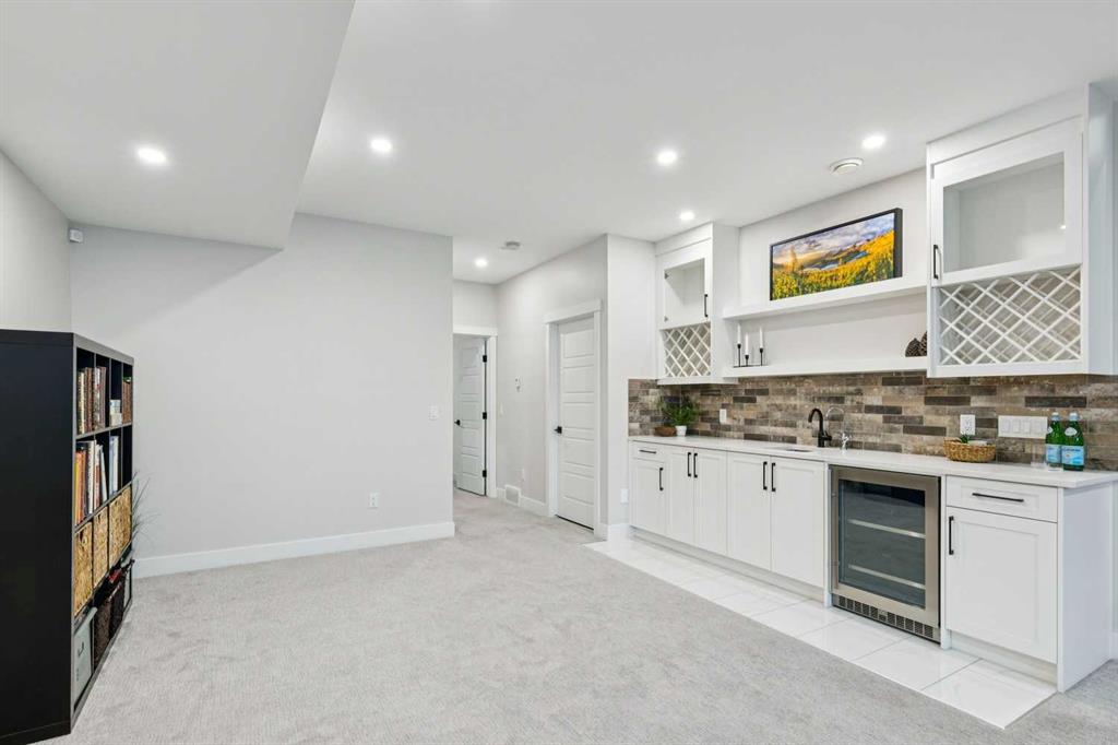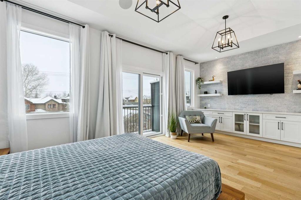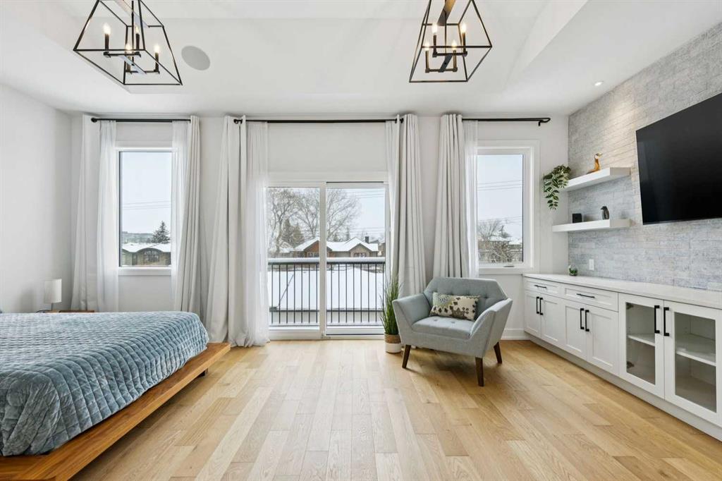 WOW ! Locals love this pocket of Hillhurst for its walkability to top-rated schools and its charming, tree-lined streets. Tucked away from main thoroughfares and set on an extra-deep 135’ west-facing backyard, this home offers a quiet residential feel that’s increasingly rare in the inner city. Savvy buyers will immediately recognize the value of purchasing a truly turn-key, like-new home where all of the thoughtful upgrades have already been completed. Tasteful custom window coverings, upgraded lighting, central air conditioning, Kinetico water softener, feature-painted walls, added shelving and hooks throughout, custom wool stair runners, built-in ceiling speakers, and a statement custom front door — it’s all done. The property is expertly landscaped, both front and back, including a beautiful custom stone patio that creates a perfect outdoor entertaining space. The fully finished garage is EV-ready and drywalled and painted for a clean, polished look. The interior selections are clean and timeless, yet still full of personality. Ceiling heights throughout the home elevate the overall feel — soaring 10- and 12-foot ceilings on the main floor, 10-foot ceilings upstairs, and 9-foot ceilings in the fully finished lower level create a bright, airy atmosphere rarely found in infill properties. The main floor layout is ideal for both daily living and entertaining. A stunning 16-foot island anchors the kitchen — a true statement piece and natural gathering space for friends and family. The kitchen is beautifully appointed with full-height crisp white cabinetry, quartz countertops throughout, abundant storage, and expansive prep space. Premium appliances include a 5-burner gas cooktop, wall oven, convection microwave, dishwasher, and a 48-inch side-by-side built-in refrigerator, creating a seamless, high-end aesthetic. Whether hosting a dinner party or enjoying casual mornings at the island, this space delivers exceptional style and functionality. The front dining area overlooks the charming tree-lined street, while the rear living room — featuring a fireplace with included Samsung Frame TV — opens through sliding doors to the sunny west-facing deck and professionally designed backyard, perfect for summer evenings and entertaining. The mudroom is thoughtfully designed with built-in lockers and bench seating, and even the front entry impresses with a spacious walk-in closet. Upstairs, the primary retreat enjoys west exposure and a private balcony overlooking the lush neighbourhood streetscape — perfect for catching the evening sun. The spa-inspired ensuite features a freestanding tub, custom glass shower, double vanity, heated floors, and a private water closet. The upper laundry room includes side-by-side Electrolux machines, sink, and hanging space. The fully finished lower level is where the fun happens. Featuring radiant in-floor heating, a spacious open recreation area, and a massive entertainer’s bar complete with beverage centre !